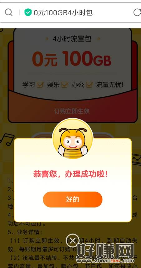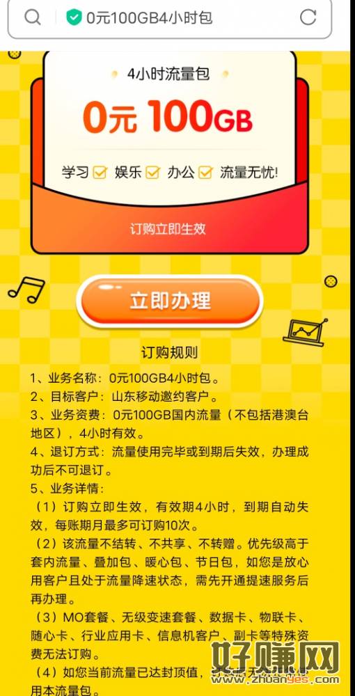 领取4小时100GB国内通用流量(不包括港澳台地区),领取后立即生效,4小时后自动取消,无需支付费用,每账期月最多可领10次,更多福利可发送999到10086查询【中国移动】