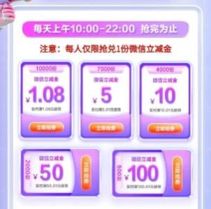 活动到11月31日截止,每天10点,抢1.08-100元微信立减金!每人限一次!