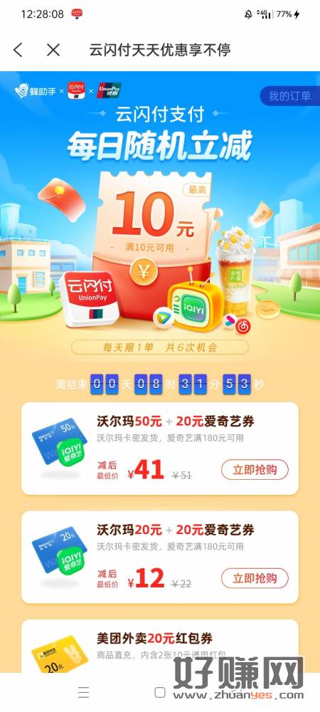 蜂助手首页横幅进去买20沃尔玛卡,银行卡留个十三十四块钱,不够买就反复刷,利润几块钱,每天一次,可以买六次,没满的继续去!