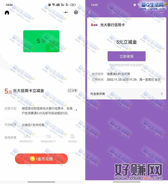 5元光大信用卡微信立减金秒到卡包 1金币兑换即可