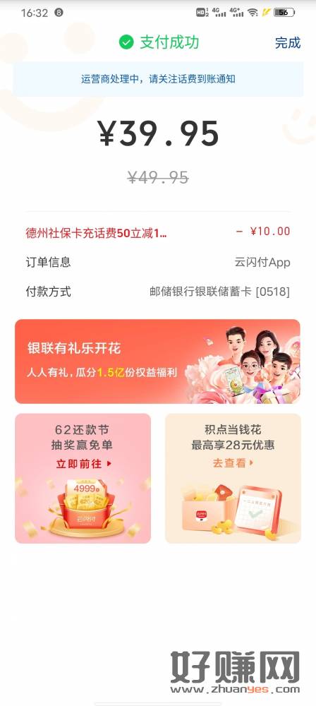 云闪付充值50话费立减10,不知道对卡有没有要求,需要的去