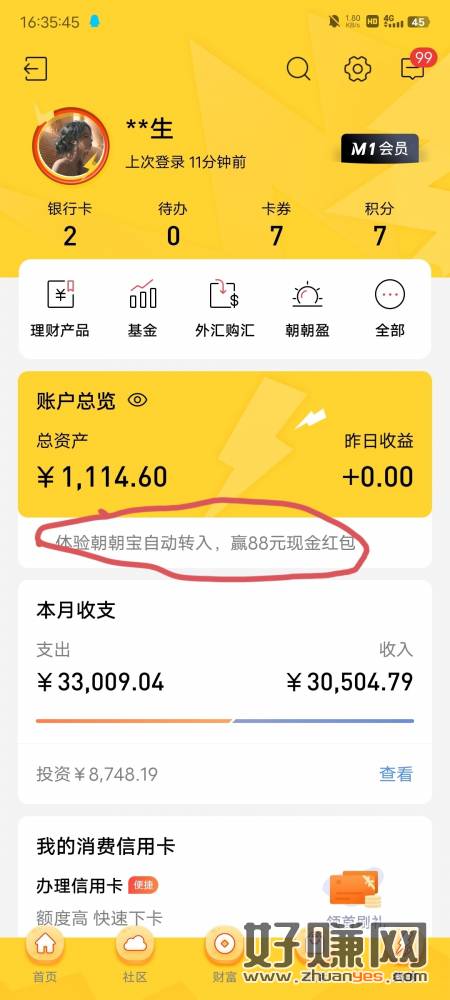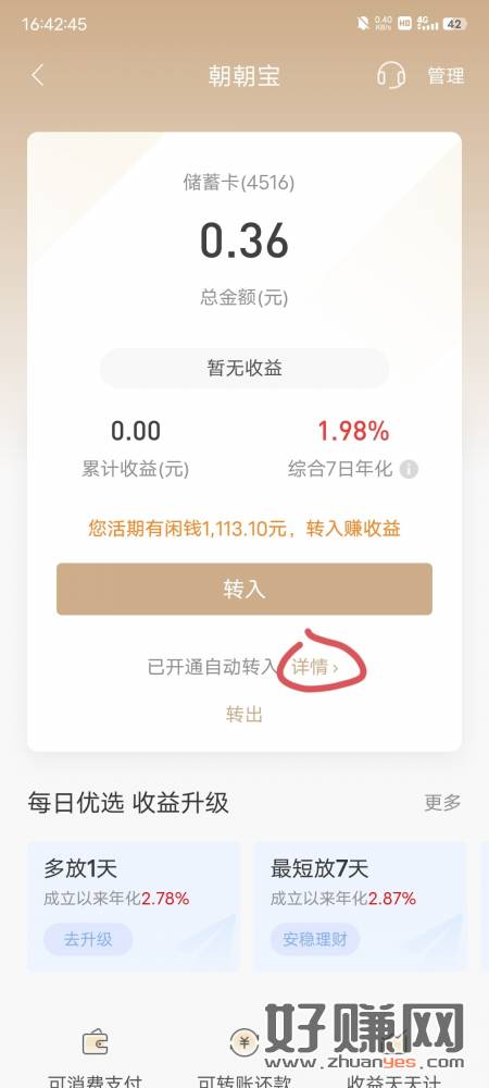 招商银行去看看提现要招商卡 开了以后首页搜索朝朝宝详情去
