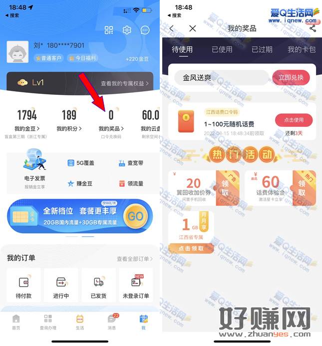 电信营业厅APP-我的-我的奖品-输入口令即可领取话费
