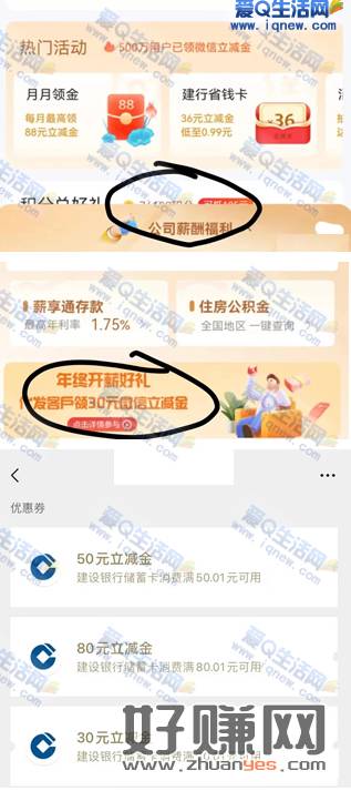 操作指南:建行手机银行-搜索“尊享权益”-最下面公司薪酬福利展开-最下面年终开薪好礼代发客户30元立减金
