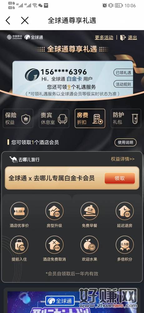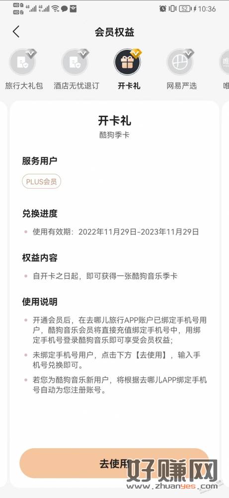 移动全球通用户 尊享礼遇 可领一年去哪网PLUS年! 然后去去哪APP 点权益 可以领取3个月酷狗 这个酷狗应该可以卖 不限制手机号好像 不过不知道是不是豪华的 还有唯品会20卷 等等 !这个PLUS 外出旅行权益还挺多的 比如机场贵宾厅快速安检 高铁贵宾等等