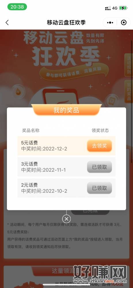 中国移动云盘小程序。领话费 不同地区东西不一样。自测。限中国