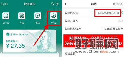 新一期!农行APP搜索“数字人民币”->先充0.01->然后再转张0.01到其他数字钱包(没有ID可以看图中的ID)->转成功后别关闭!下面会显示抽奖点进去