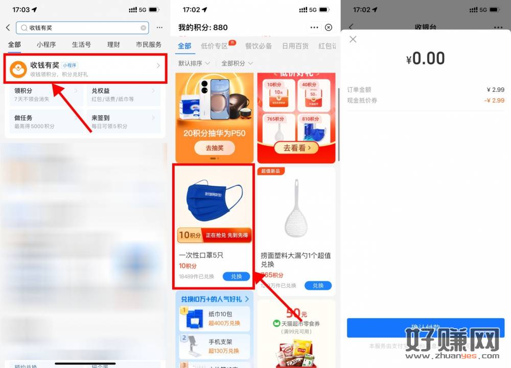 【支付宝0元撸一包5只口罩包邮】大部分人都有!支付宝搜索“收钱有奖”->点小程序进入->下拉找到“一次性口罩5只 10积分”->用10积分兑换0元下单即可!