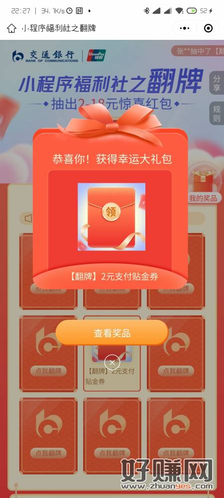 微信搜索交通银行小程序 首页自动弹窗 是个翻牌活动,进去翻牌抽贴金券
