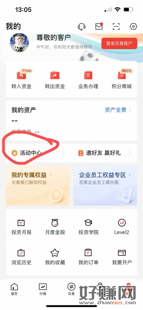 开过养老金账户的打开中金财富app点开我的找到活动中心,第一