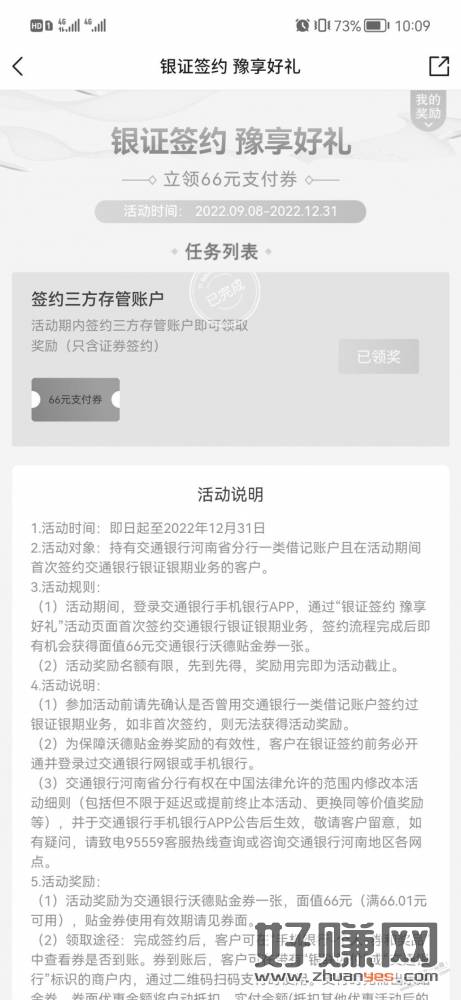 交通银行66元支付券,手机银行开一个河南地区二类卡,然后随便一个证券账户的存管卡换绑成任意地区交通一类卡,换绑成功。交通银行App搜“银证签约”——豫享好礼活动领66元交通银行支付券。