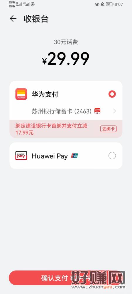 华为pay冲话费,提示绑建行储蓄卡立减17,可以联通30