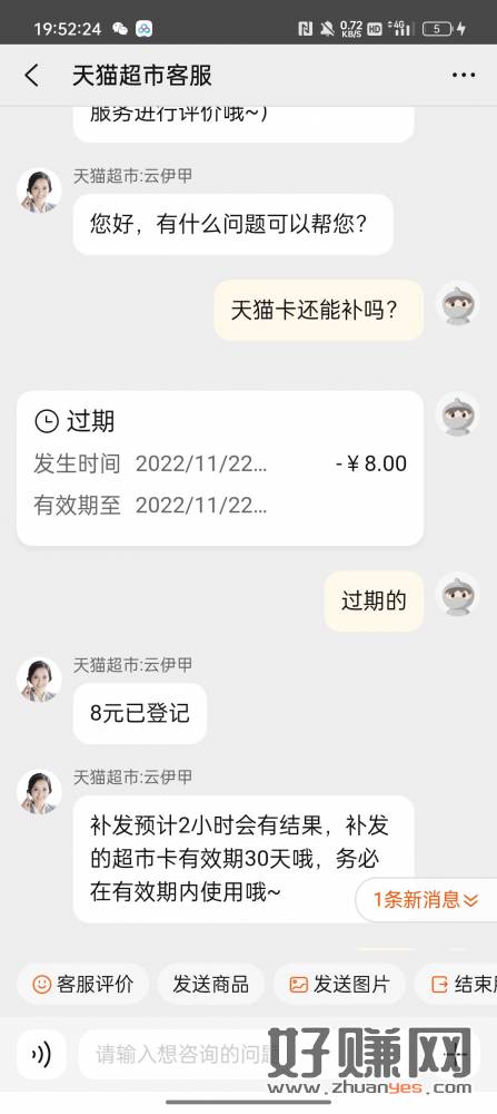 方法一:天猫超市 我的 客服小蜜 天猫卡补卡,每天五张