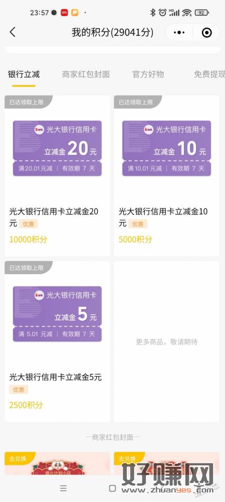 有商家积分的又又又可以换光大的立减金了,35毛。没商家积分的没办法!