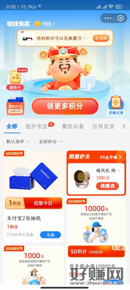 支付宝 收钱有奖 1积分2包纸巾