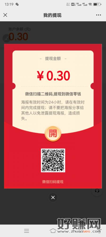 点图中了,点击下面的去提现,手动提现,