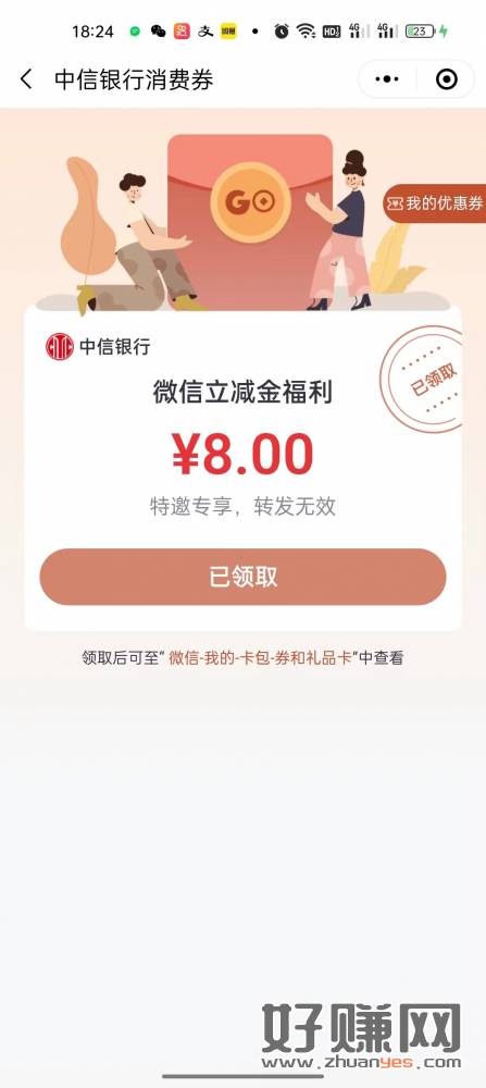 地址复制到微信任意聊天窗口打开领中信银行5-20元微信立减金。