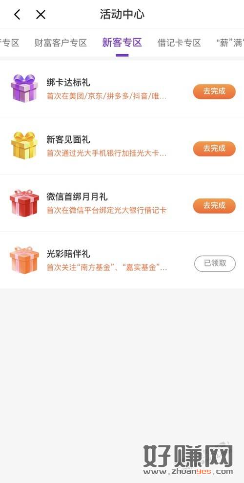 光大APP→我的→下拉找到我的权益进去→新客专区→更多——光彩陪伴礼(RT)