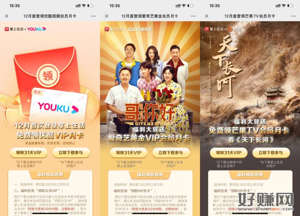 上面掌上生活补充3个链接,一共四个会员 只能选1个领取!