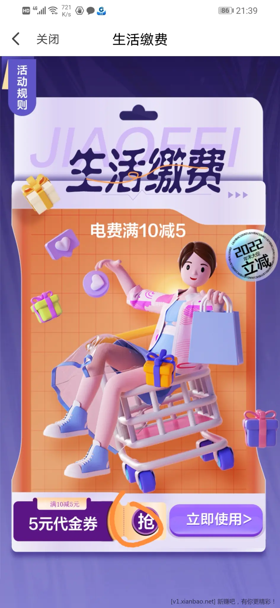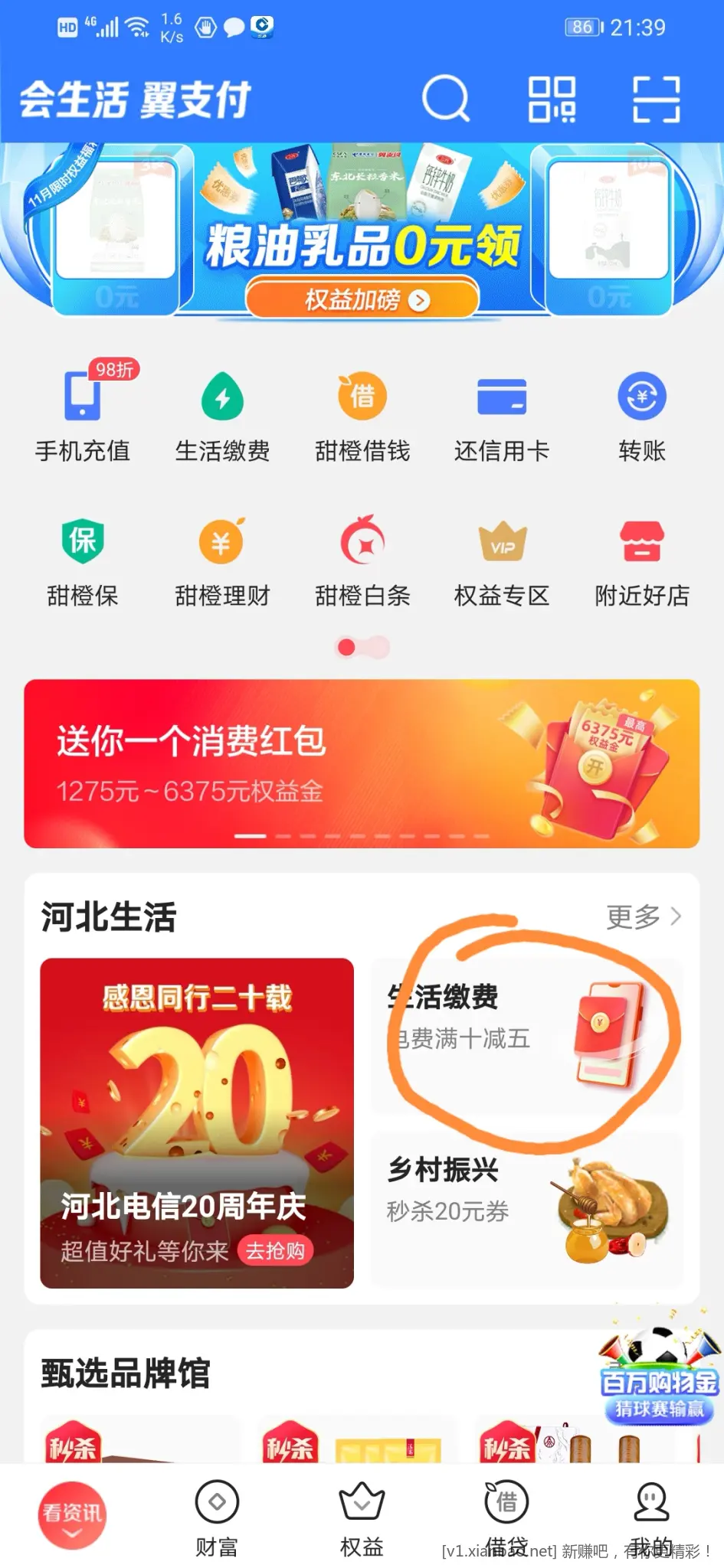 河北翼支付领缴费券,交电费10-5