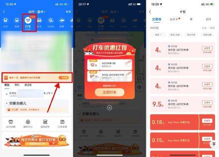 【高德打车每天抽随机打车券】支付宝APP首页“出行”->顶部“打车”->点击横幅每天领随机打车券->这个券支付时才显示抵扣,可叠加高德原本的打车券!
