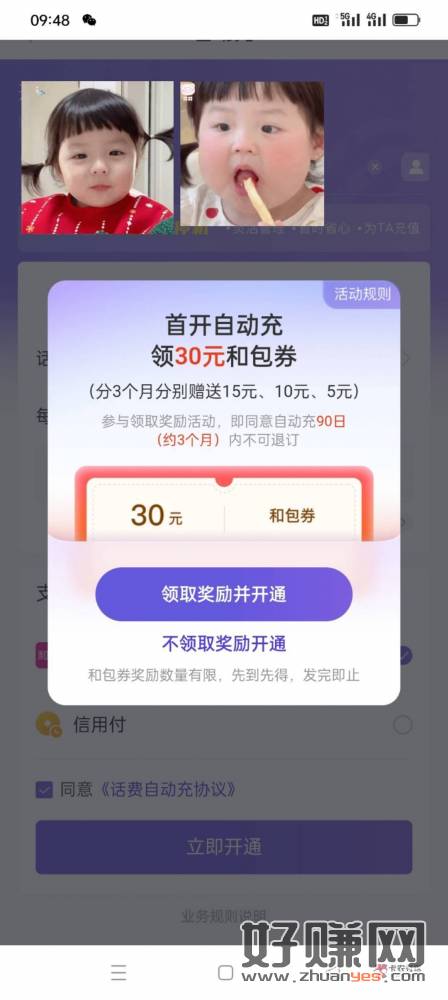 新毛毛】移动和包,首页拉到底,开通自动充,自动到账15元,可5户同实名,已毕业,绑卡你绑定非柜卡就好了又扣不到,15券卖电费9折,