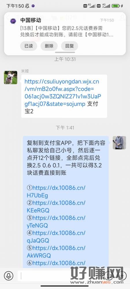 复制到支付宝APP,把下面内容私聊发给自己小号,然后逐一点开12个链接,全部点完后兑换2.5 0.6 0.1,一共可以得3.2块话费直接到账