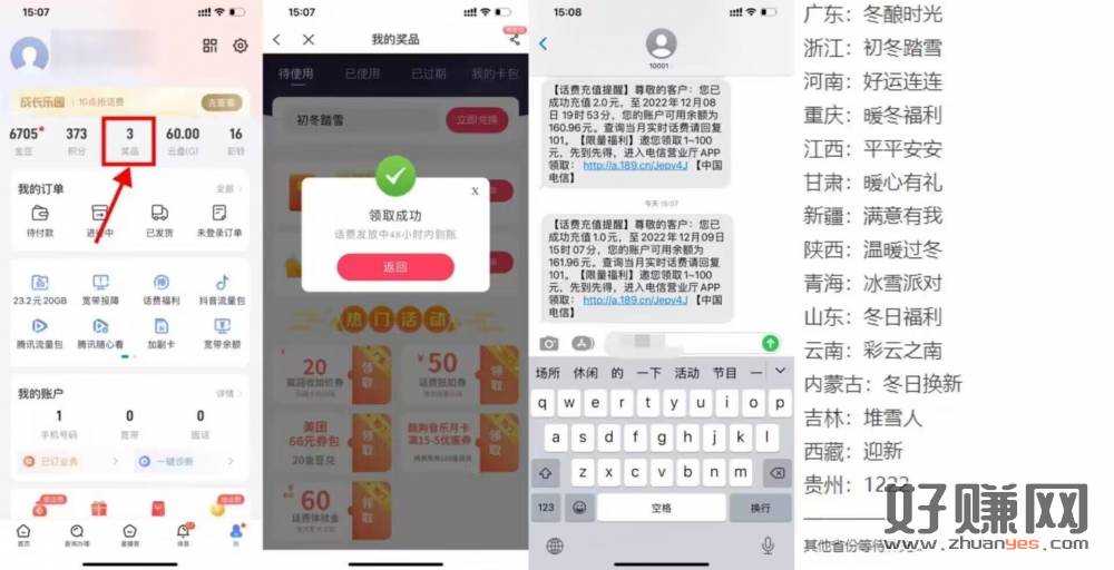 【电信部分省份领取1~100元话费】新一期!电信APP->我的->我的奖品->输入自己地区对应省份的囗令抽话费!