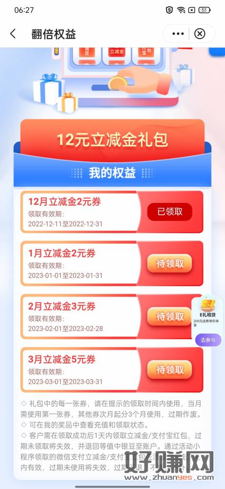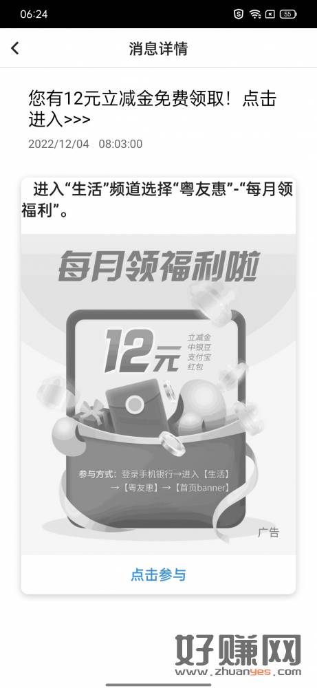 中国银行12立减金,我的,打开消息!分4个月领、最高25元,