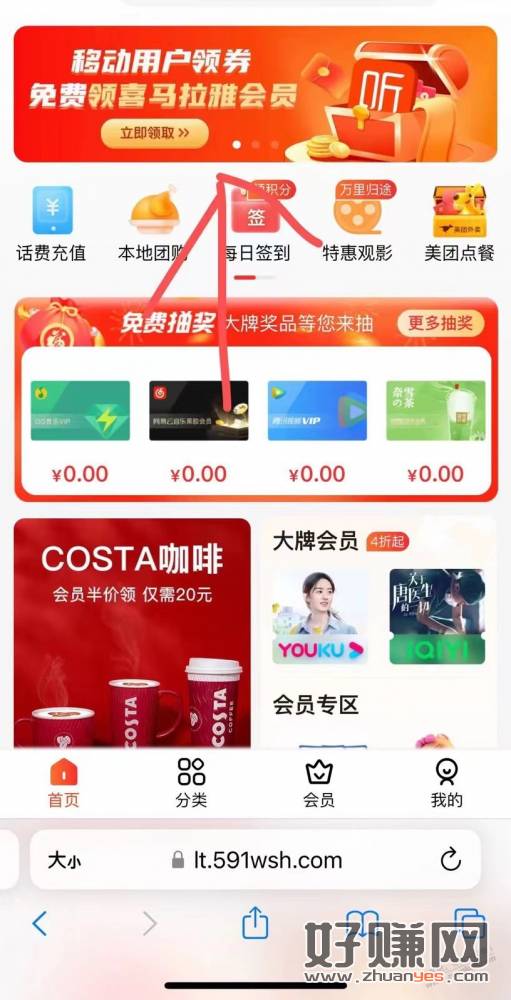 到手机自带浏览器打开,点击顶部0元购喜马拉雅月卡,自动跳转到移动和包购买。