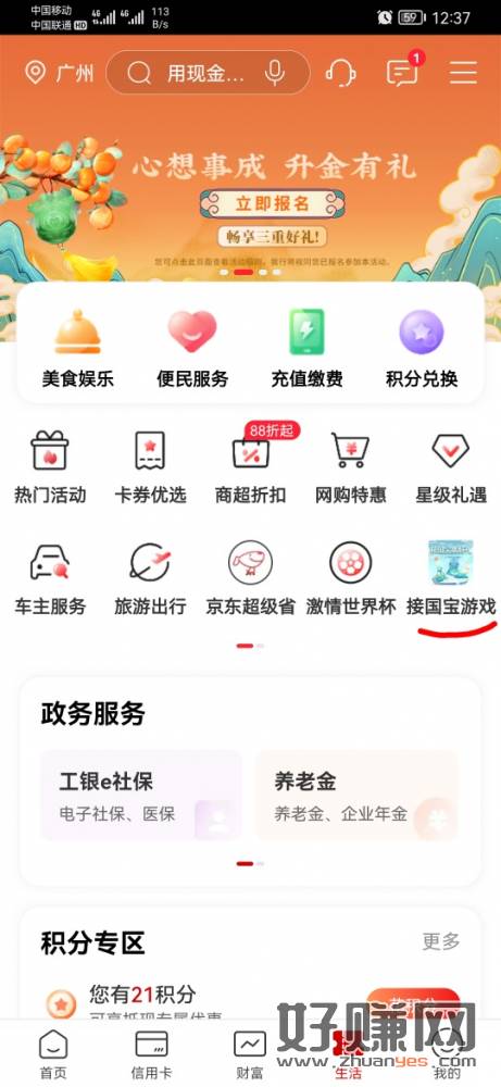 工行app生活,左上角定位广州,找接国宝游戏,两次机会抽立减金