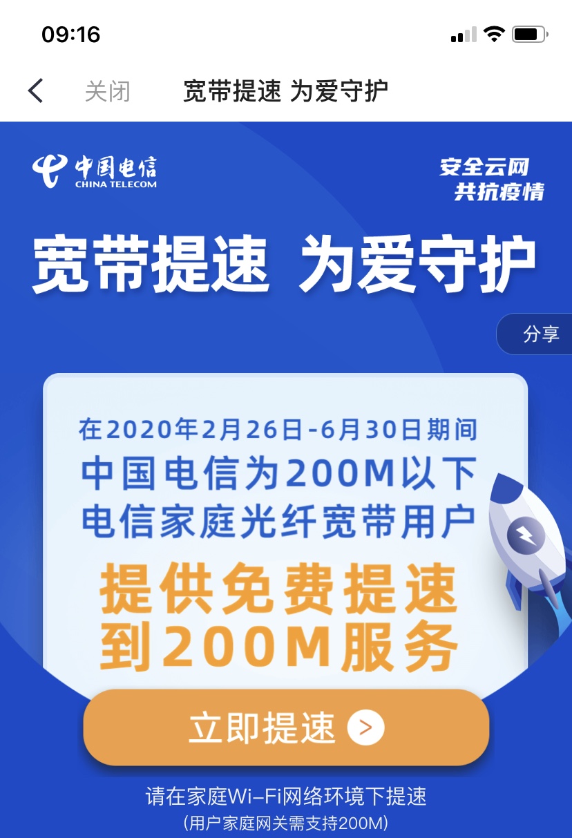 电信白嫖提速200m,要求是个人就行,老哥们给我加果子