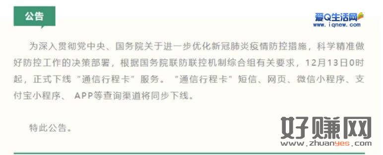 现在国家真的是放松管控了,根据国务院联防联控机制综合组有关要求,12月13日0时起,正式下线“通信行程卡”服务
