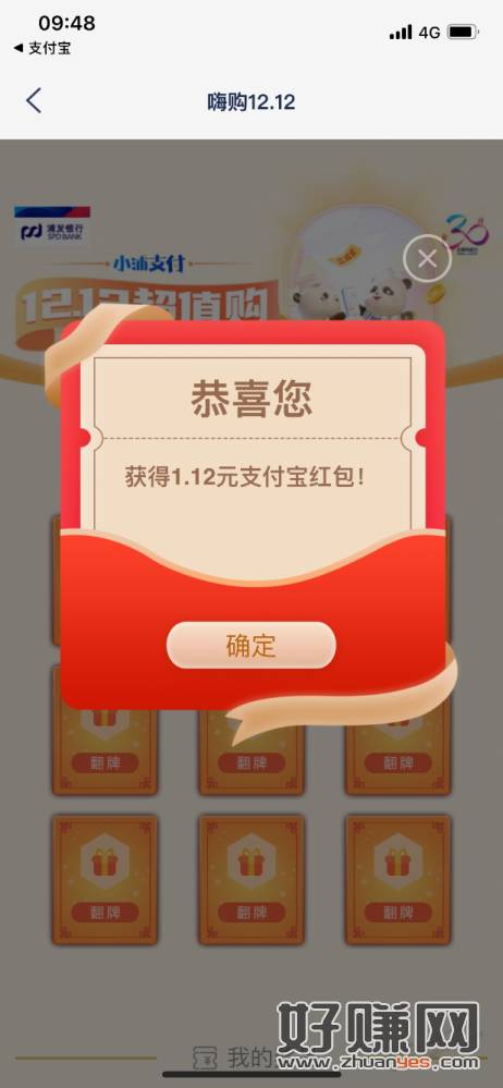 浦发app,热门活动,嗨购12.12,转支付宝余额宝1212就能抽奖,我抽了一块多,看看大家运气了