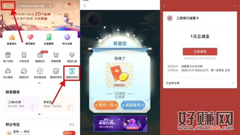打开工行APP底部“生活”->左上角手动选择“广州”->接国宝游戏->玩个简单游戏抽立减金->在“我的奖品”中跳转领取