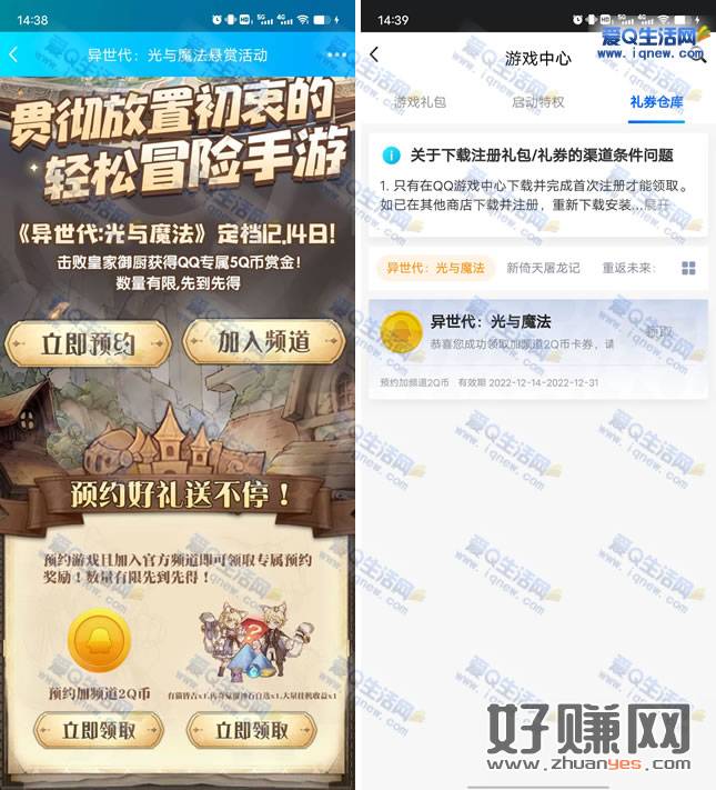 需要QQ预约《异世代:光与魔法》手游+加入频道,可领取2Q币卡券