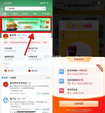 【支付宝领麦当劳0元辣翅券】支付宝搜索“麦当劳”->点击横幅进入->领取麦当劳辣翅券和25减5元券,辣翅券需到店随单消费即可使用