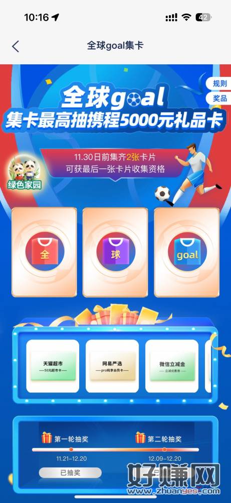 浦发银行APP-首页顶部[ 全球goal ]-任务集卡下方抽奖