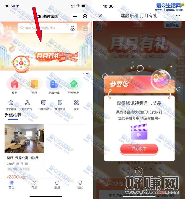建融家园月月有礼抽腾讯视频月卡/QQ音乐月卡等