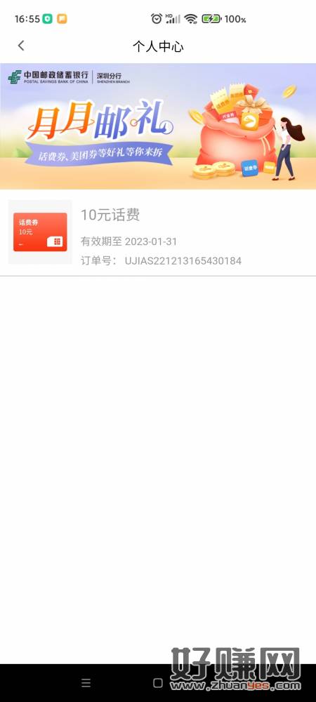 邮储银行APP,月月邮礼抽话费,中了10话费!