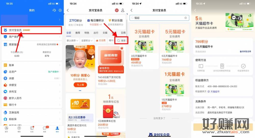 【支付宝积分兑换9元天猫超市卡】新一期!支付宝APP->我的->支付宝会员->搜索“猫超”->279/499/799积分分别兑换1/3/5元天猫超市卡