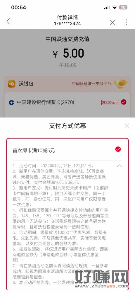 前段时间做过沃钱包35那个活动那个时间段注册的沃钱包去联通app冲话费选择沃钱包支付10减5共一万名额刚冲