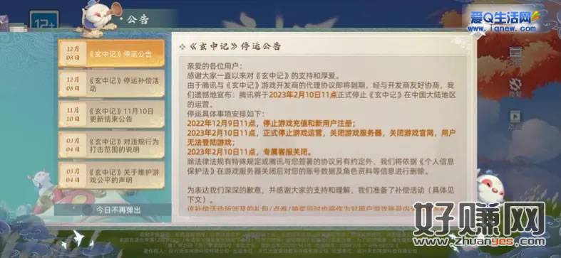 2022年12月9日11点,停止游戏充值和新用户注册