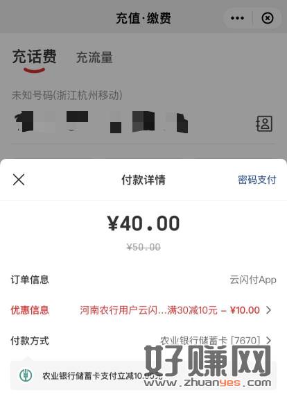 河南农行卡,云闪付充话费30-10