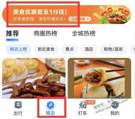 百度地图app首页,底部“周边”,横幅“美食优惠低至1分钱”进去