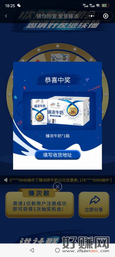 臻浓牛奶小程序,刚刚中一箱牛奶,首页弹窗