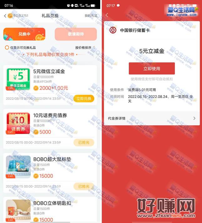 中行BOBO鱼塘月月兑好礼 亲测5元微信立减金秒到