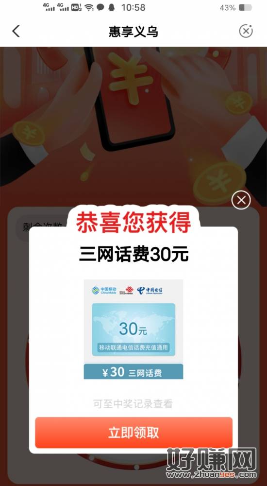 农业银行飞浙江-城市专区-金华代码196999)—惠享义乌—拼手气赢好礼,支付0.06元即可参与抽奖,有机会获得30元话费券(是否受邀自测)
