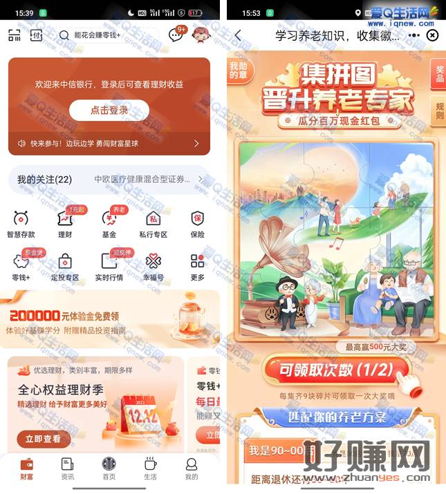 1.中信银行APP-财富-中间滚动横幅【200000元体验金免费领】-第一个匹配你的养老方案-每个年代都点一下去看看 最后领取奖励即可
