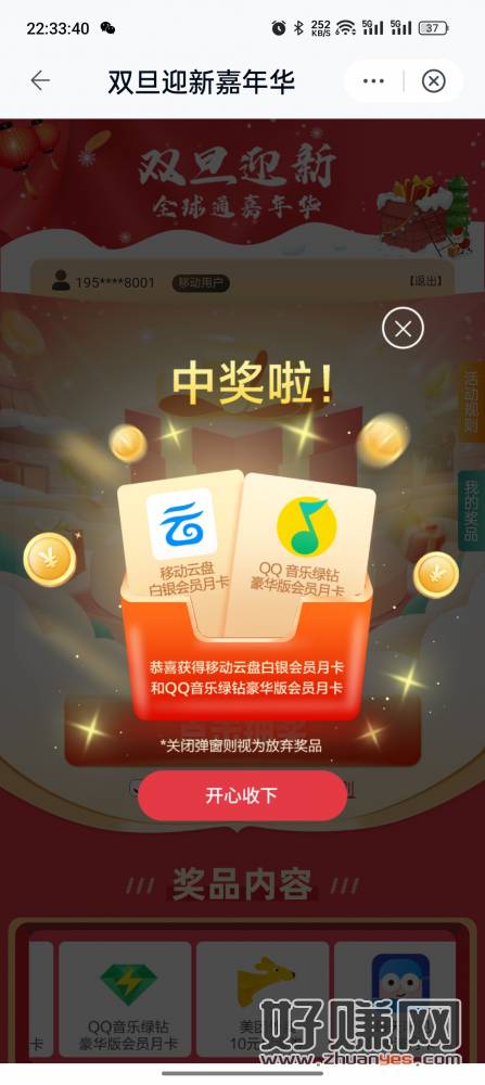 中国移动云盘双旦迎新抽爱奇艺/豪华绿钻/美团外卖券,仅限移动用户可以参与,进入活动可以获得一次抽奖机会